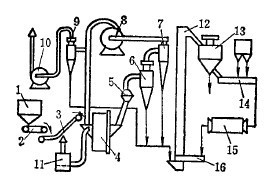 未被收集的微細物料在閉路風路系統中循環。閉路系統中主風機出口至磨機入口段,其靜壓值有部分為正壓,粉塵易從這一段逸出。為使主風路系統在負壓條件下工作,防止灰塵溢入室內漫延,減少微細物料和水分在主風路系統中造成惡性循環,設有副風路系統。副風路系統設在主風機與自磨機之間,由文氏管11洗滌器12及輔風機13組成。經副鳳路系統凈化后的氣流排于大氣中。