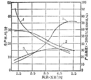 風量大,單位時間內輸送的物料多,產量就高;但同時也由于風量大、風速高,磨礦產品也隨之變粗。風量與產量、產品粒度的關系如圖2 所示。