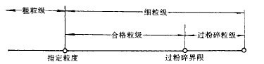 試驗方法中的一個重要問題在于,如何判定磨礦效果的好壞。就以生產率而論,達不到指定級別(如0.074mm或其它粒度)的稱為“粗級別”,達到指定級別及以下的稱為“細級別”,而細級別中又包含“過粉碎”級別,幾者之間的關系可表示在圖3-5-2中。