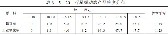 的轉(zhuǎn)動(dòng)形成了筒繞Ⅰ號(hào)軸的公轉(zhuǎn);Ⅱ號(hào)輪帶動(dòng)Ⅵ號(hào)輪形成磨筒繞其自身軸的自轉(zhuǎn)。這種磨機(jī)兼有行星磨和振動(dòng)磨二者的特點(diǎn),具有高頻沖擊和磨剝的雙重作用,故磨碎作用強(qiáng),是一種有效的超細(xì)磨碎設(shè)備。表3-5-20示出了用該磨機(jī)磨碎鋯英石和工業(yè)氧化鋁的產(chǎn)品粒度分布。