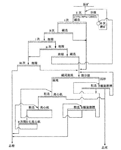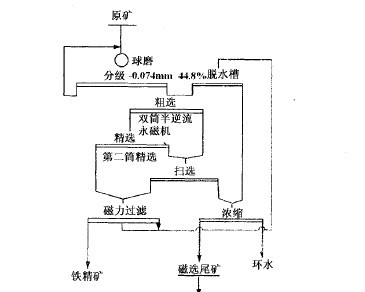 用磁-重聯選,用弱磁選設備優先選出強磁性礦物———磁鐵礦,然后用重選法將赤鐵礦與脈石分開,工藝流程如圖9-1-5,采用該流程所得選礦指標是:當原礦品位29.71%Fe時,可得精礦品位65.10%Fe,回收率71.00%Fe。