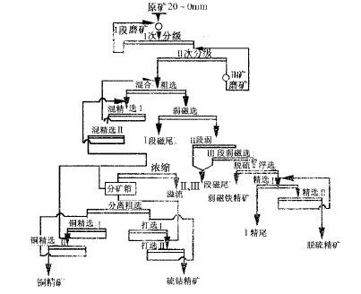 當原礦品位為:46.76%、0.492%Cu、2.112%S、0.021%Co時,可獲得品位為58.1%Fe、回收率89.81%Fe的鐵精礦,品位為18.37%Cu、回收率64.56%Cu的銅精礦,品位為33.25%S及0.24%Co、回收率26.80%Co的硫鈷精礦。