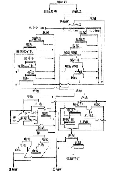 位較高(50%左右),但礦體較薄或夾層較多,采礦時廢石混入,使礦石貧化,對這種礦石可采用只破碎不磨礦,在粒度較粗的情況下,通過重選丟棄粗粒尾礦,從而恢復地質品位。獲得粗粒的中等品位精礦,或進一步加工處理,或直接送高爐冶煉,這種稱為粗粒重選。另一種是對嵌布粒度較細的紅礦或混合礦(即含弱磁性的紅礦和強磁性的磁鐵礦),經破碎,磨礦使鐵礦物單體分離后,通過重選或磁重聯選,得到細粒高品位精礦,這種稱為細粒重選。