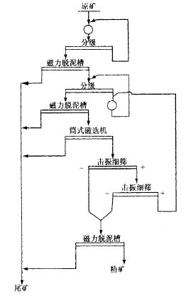 目前,我國有一些選礦廠應用強磁場磁選機直接選別赤鐵礦或假像赤鐵礦,實踐證明,這是一種較好的有效方法。例如某選礦廠處理含磁鐵礦和赤鐵礦的礦石,應用弱磁場磁選機和強磁場磁選機分別回收磁鐵礦和赤鐵礦。其工業試驗流程如圖1所示。采用該流程達到的指標是:原礦品位34.20%(FeO3.7%)時,精礦品位達56.46%Fe,回收率78.95%。