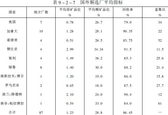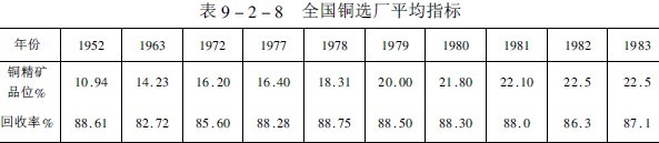 國內銅選礦現狀我國現有32座大中型銅選廠,年產方噸以上精礦含銅量的有銅錄山、德興、白銀、易門、落雪等選廠。口處理量在3000噸以上的有13座,500~3000噸的有15座。礦石入選品位平均為0.94%,雖然原礦品位逐年下降,但銅精礦品位則隨著選礦工藝的發展和技術進步而逐年提高,如表9-2-8所列。