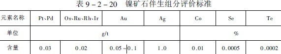 硫化鎳礦除含銅外,還伴生有鉑族金屬、鈷、金、銀、硒、碲等有價(jià)元素,評價(jià)標(biāo)準(zhǔn)列于表9-2-20。