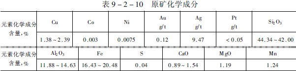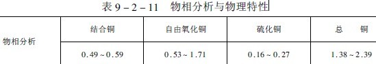 該礦屬于石英閃長斑巖與石灰系灰巖接觸交代矽卡巖銅礦床。礦石呈土狀,氧化程度較深。由于成巖階段次生富集作用,銅液擴散推移過程中與硅、鐵和鋁的鹽類及其氧化物形成結合性氧化銅,覆蓋于表面及間夾于孔雀石類型礦石中。含銅礦物以孔雀石為主,有少量藍銅礦、硅孔雀石和水膽礬等。鐵的礦石主要為褐鐵礦,磁鐵礦和亦鐵礦次之。脈石除鐵質粘土外,還有石英、云母、石榴子石、角閃石、蛇紋石、綠泥石和方解石等。原礦中鐵質粘土含量很高,-200目高達48%,礦石含水27.1%,較大塊的礦石300毫米左右。原礦物質組成列于表9-2-10和表9-2-11。