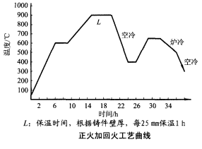 7、精整與熱處理:開箱以后盡快清理冒口根部殘砂,保證在100℃以上熱割冒口。清砂時不能用風鏟直接與鑄件表面接觸,防止損傷鑄件表面。按照下圖所示的熱處理工藝曲線,將試塊和鑄件同爐進行熱處理。