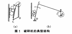 顎式破碎機兩種典型結構如下圖1所示。圖1-a所示顎式破碎機,由機架AD、曲軸AB、 動顎板BC、肘板CD組成。圖1-b所示的顎式破碎機,曲柄AB帶動連桿BC和搖桿CD運動,它與前一類顎式破碎機雖然采用相同的曲柄搖桿機構,但工作原理不同。