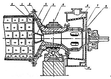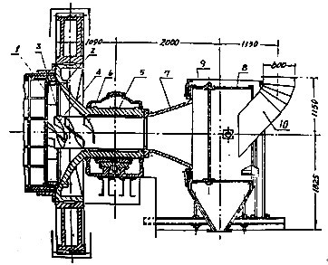 3、邊緣傳動球磨機的卸料端(圖3)。卸料篦子1和磨頭2間有葉片3,在篦子的中部裝有螺旋葉片4,葉片3能將物料帶起并撒在螺旋葉片4上,通過螺旋葉片4和裝在套筒5里的螺旋葉片6使物料順暢地從軸頸中卸出,7為漏斗,用螺釘固定在軸頸的端面上,物料沿著漏斗落到控制篩8上,9為機罩,10為通風管道與排風機和收塵系統相聯結。